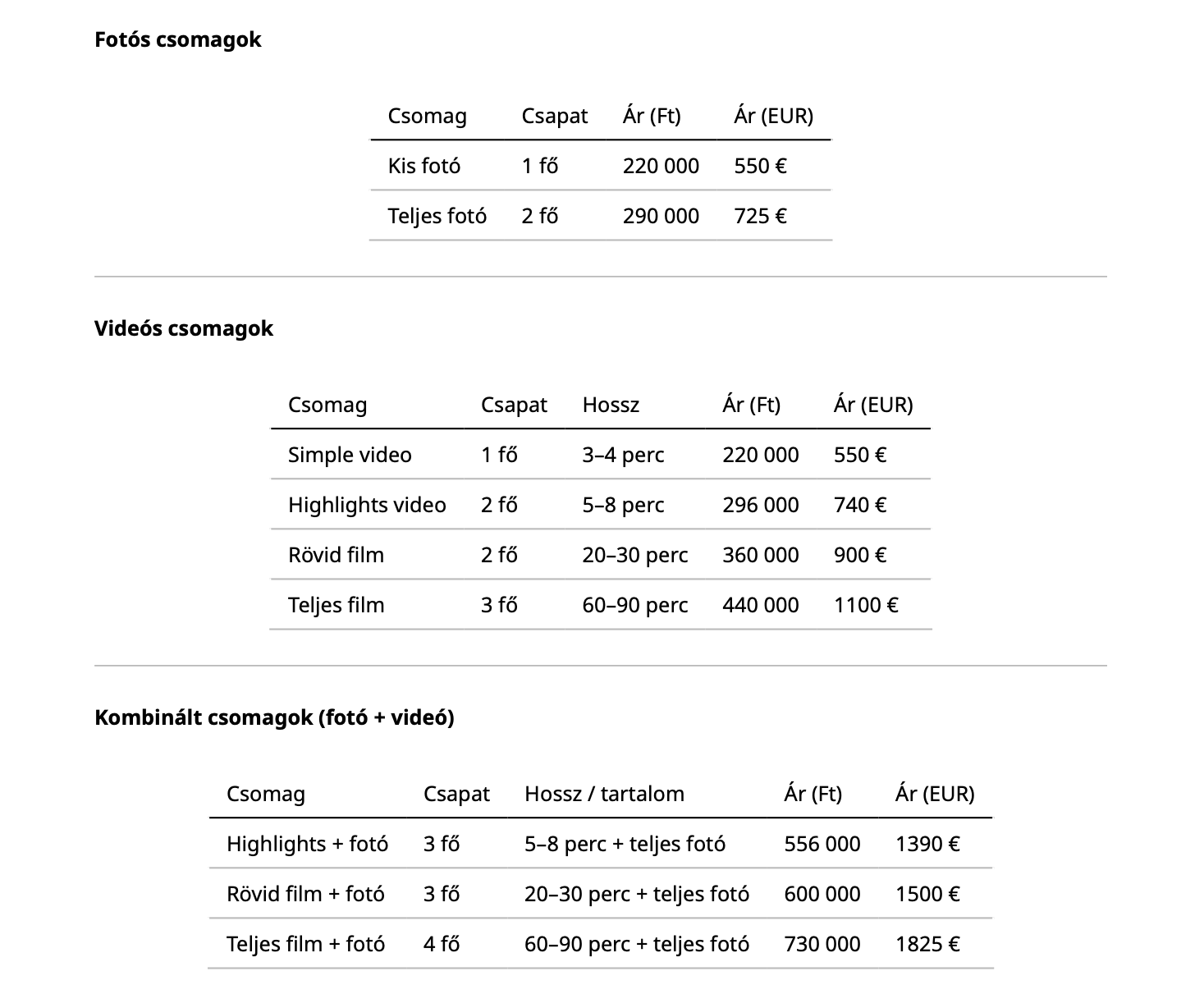 - Jegyesfotózás: 50.000 Ft